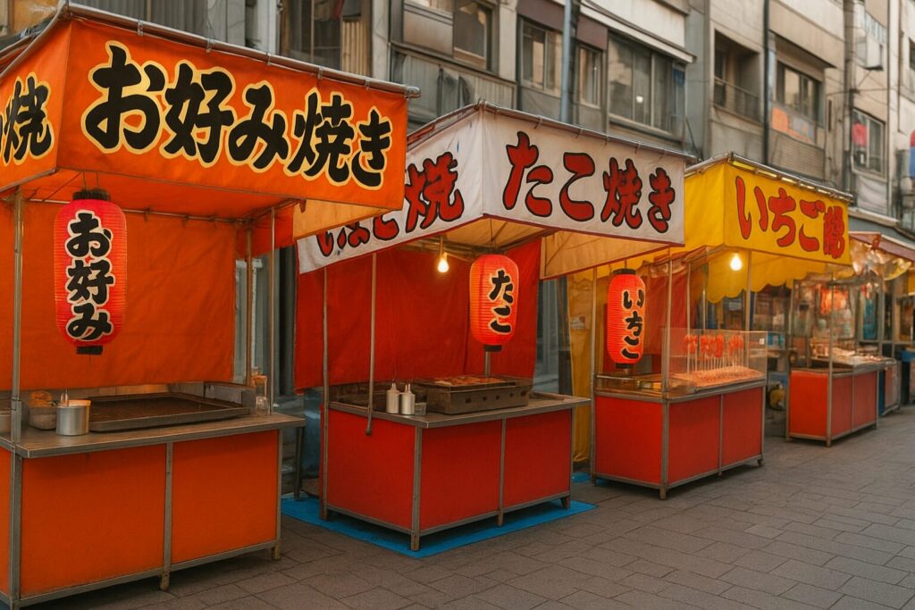 胡子神社周辺の通りには、お好み焼き、たこ焼き、いちご飴といった定番の屋台から、地域ならではのグルメを提供する屋台が所狭しと並びます。