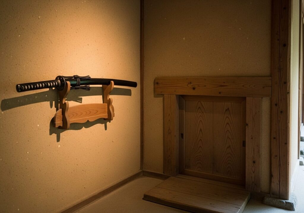これは、茶室が俗世の戦乱から離れた清らかな場である一方、いつでも戦場に戻る武士の心構えを忘れないための工夫です。